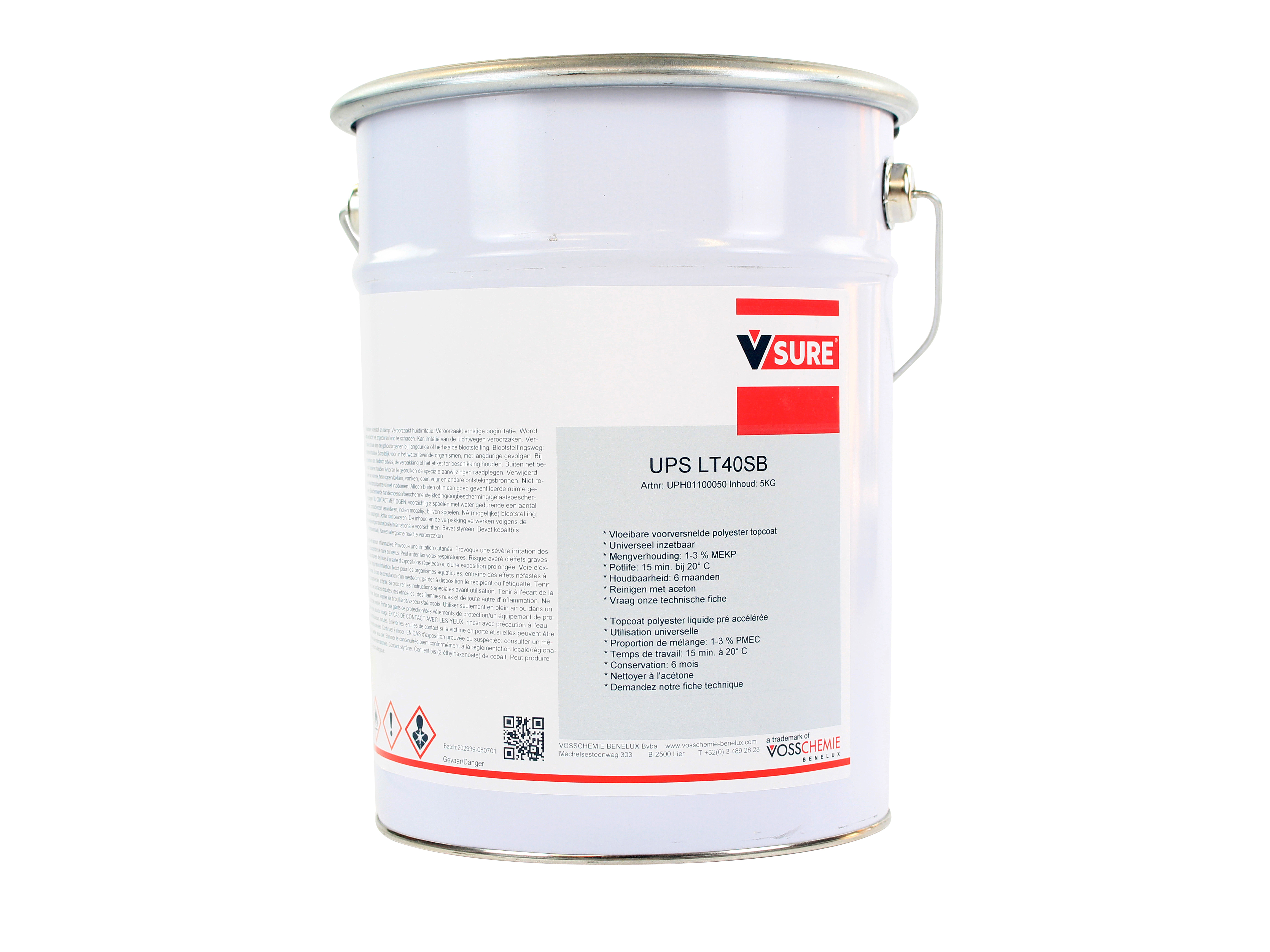 Adhesive-free final coat (topcoat) for a polyester laminate as protective layer and finish.Can be coloured with a maximum addition of approx. 5-10% UP pigment. Spraying is possible with the addition of approx. 5% styrene. Has its application in amongst others swimming pools, containers and tanks as well as elements for the construction industry. Topcoat LT 40 SB is always processed in combination with precoat T 40 BT for a good chemical and water resistance with a maximum water temperature of 30°C. Recent tests have shown that the use of salt solutions at elevated temperatures can cause black spots in the final coat. The use of this topcoat LT40SB is therefore not recommended.Tip: some colour pigments discolour faster than others! For example: dark grey will fade.